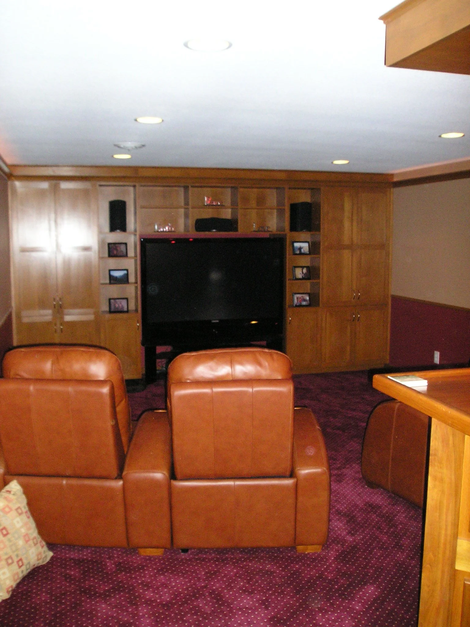 Basement finish #6 - Family Room with custom entertainment center including stone background